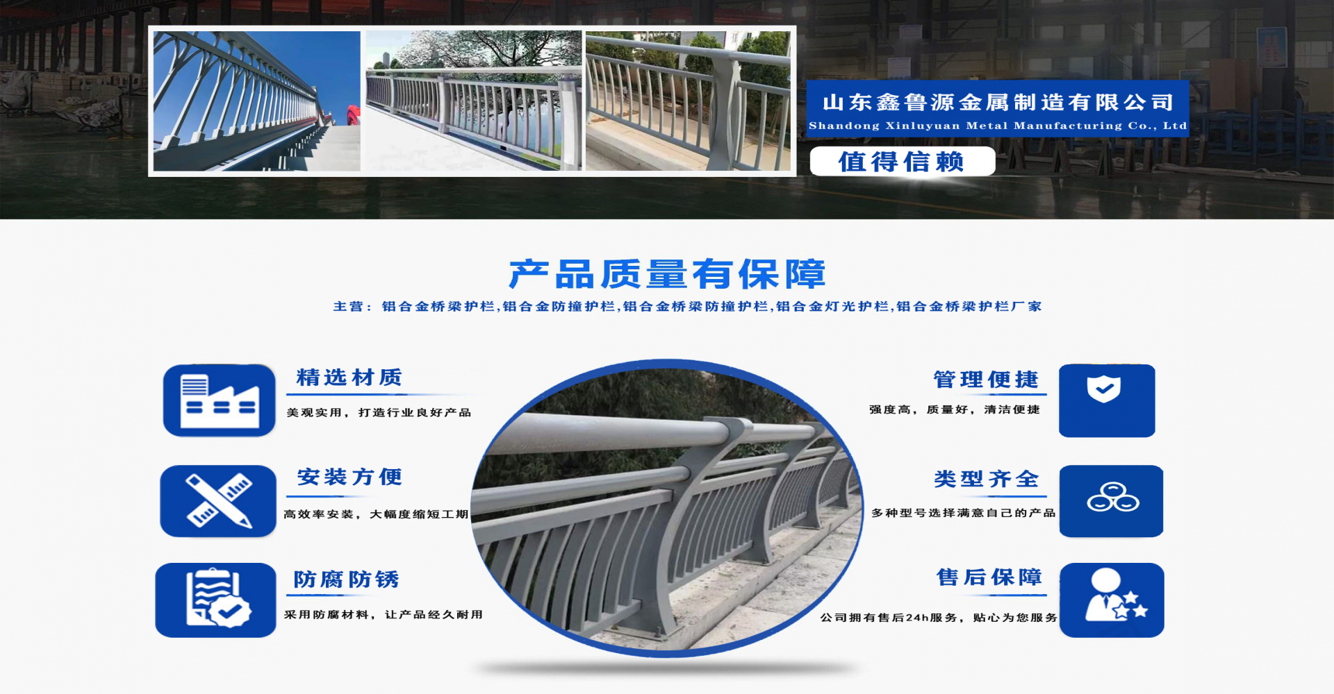 山東鑫魯源金屬制造有限公司主要經(jīng)營(yíng):鋁合金橋梁護(hù)欄,鋁合金防撞護(hù)欄,鋁合金橋梁防撞護(hù)欄,鋁合金燈光護(hù)欄,不鋁合金橋梁護(hù)欄廠家,環(huán)波梁橋梁護(hù)欄,環(huán)波梁防撞護(hù)欄。質(zhì)量可靠、經(jīng)濟(jì)實(shí)用的顯著特點(diǎn)。公司為客戶提供可靠售后保障,堅(jiān)持“以品質(zhì)立足、服務(wù)求發(fā)展”,愿與各界朋友精誠(chéng)合作、攜手發(fā)展! 服務(wù)優(yōu)勢(shì):真誠(chéng)的服務(wù)理念、完善的服務(wù)體系。公司專(zhuān)業(yè)力量充足;工程案例眾多、從業(yè)經(jīng)驗(yàn)豐富;公司以可靠質(zhì)量的產(chǎn)品,合理的價(jià)格,完善的售后服務(wù),能夠滿足市場(chǎng)各個(gè)企業(yè)的需求。 企業(yè)精神:執(zhí)著追求 持續(xù)創(chuàng)新執(zhí)著追求,就是堅(jiān)持不懈、堅(jiān)定從容,專(zhuān)注于自己的事業(yè),把能做的事情做好,不斷克服困難、把握機(jī)遇,贏得未來(lái)。 持續(xù)創(chuàng)新,就是生命不息、創(chuàng)新不止,通過(guò)持續(xù)實(shí)施技術(shù)創(chuàng)新、管理創(chuàng)新、市場(chǎng)創(chuàng)新,獲取持續(xù)的競(jìng)爭(zhēng)優(yōu)勢(shì)。...